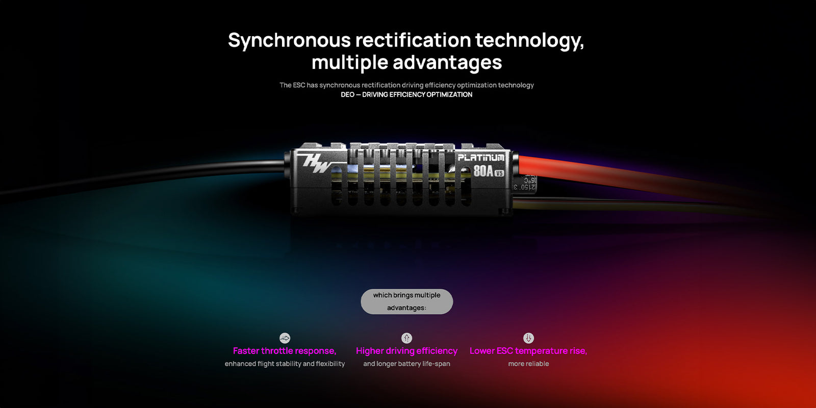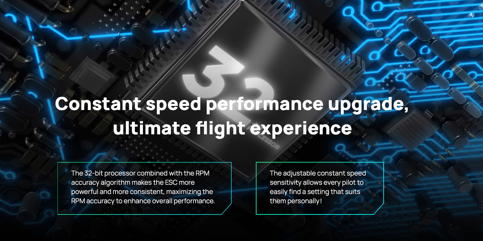 Constant Speed Performance Upgrade, Ultimate Flight Experience; The 32-bit processor combined with the RPM accuracy algorithm makes the ESC more powerful and consistent, maximizing RPM accuracy to enhance overall performance. Compared with the previous ESC, the RPM accuracy algorithm significantly improves power and consistency. The adjustable constant speed sensitivity allows every pilot to easily find a setting that suits their flying style.