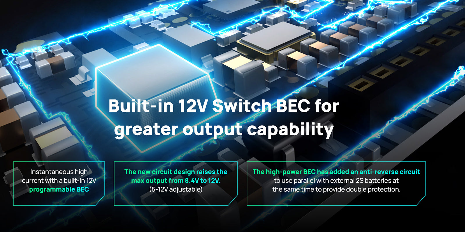 - Built-in 12V Switch BEC for greater output capability: With an instantaneous high current and a built-in 12V programmable BEC, the maximum output voltage is 12V (adjustable from 5-12V) and the maximum output current is up to 25A. The high-power BEC features an anti-reverse circuit, allowing it to be used in parallel with external batteries, providing double protection.